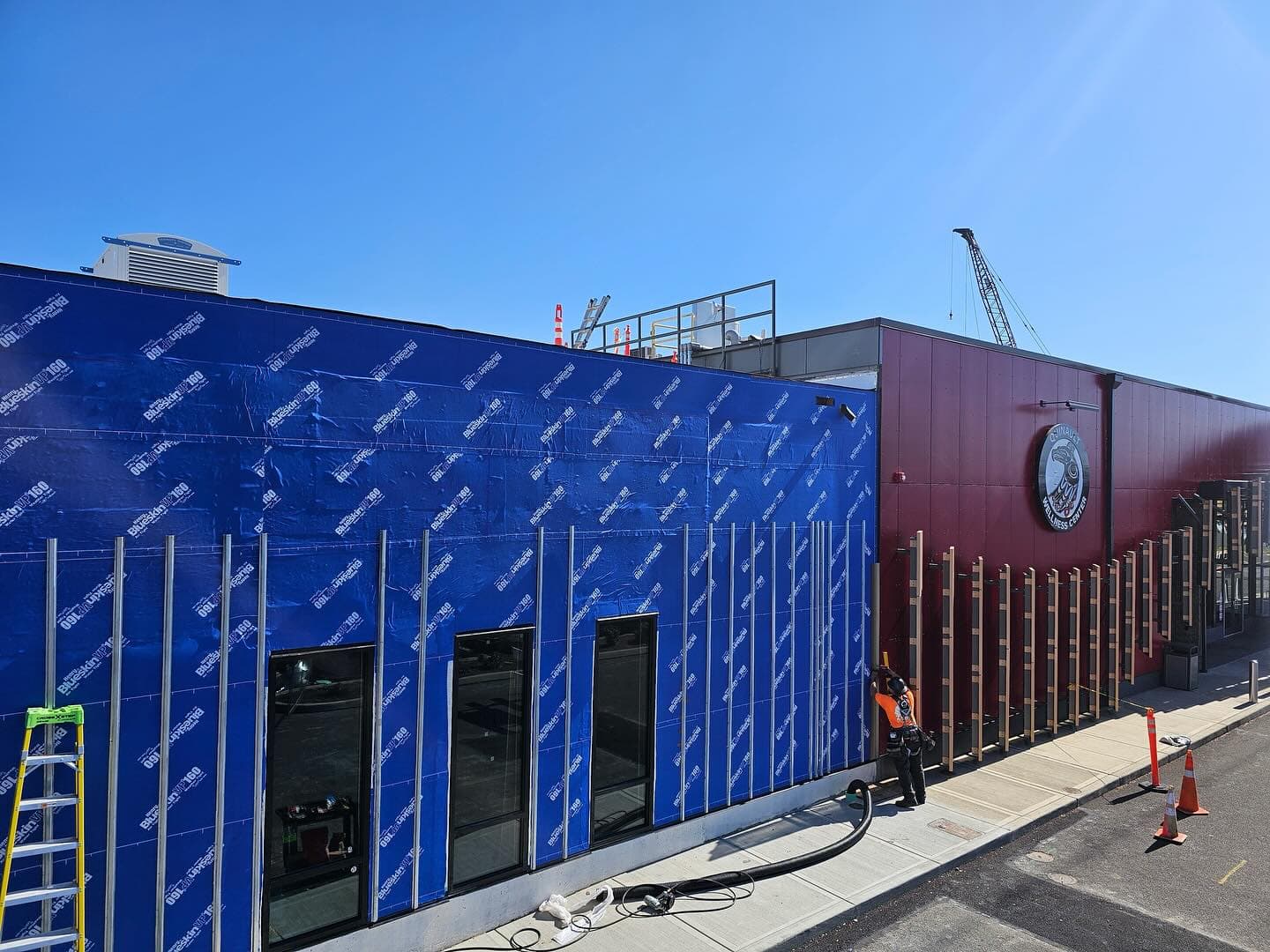 Clark Construction hard at work waterproofing the Quinault Wellness Center's expansion in August 2025.